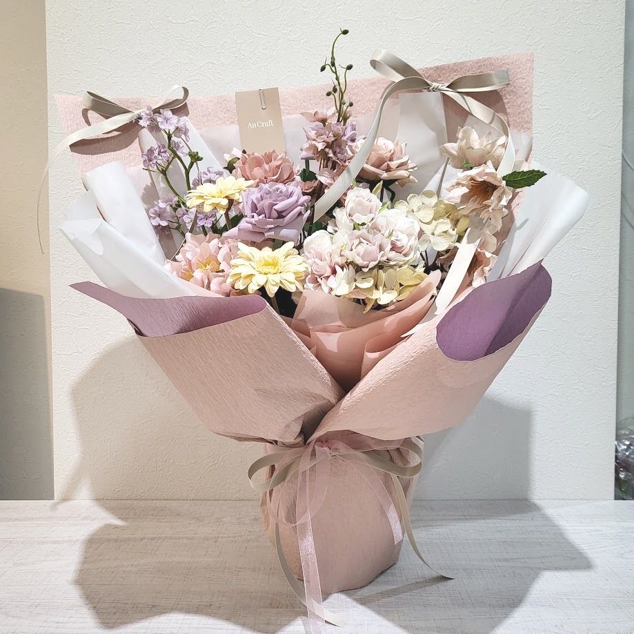 心をつかむ花色を束ねた自立型の花束。