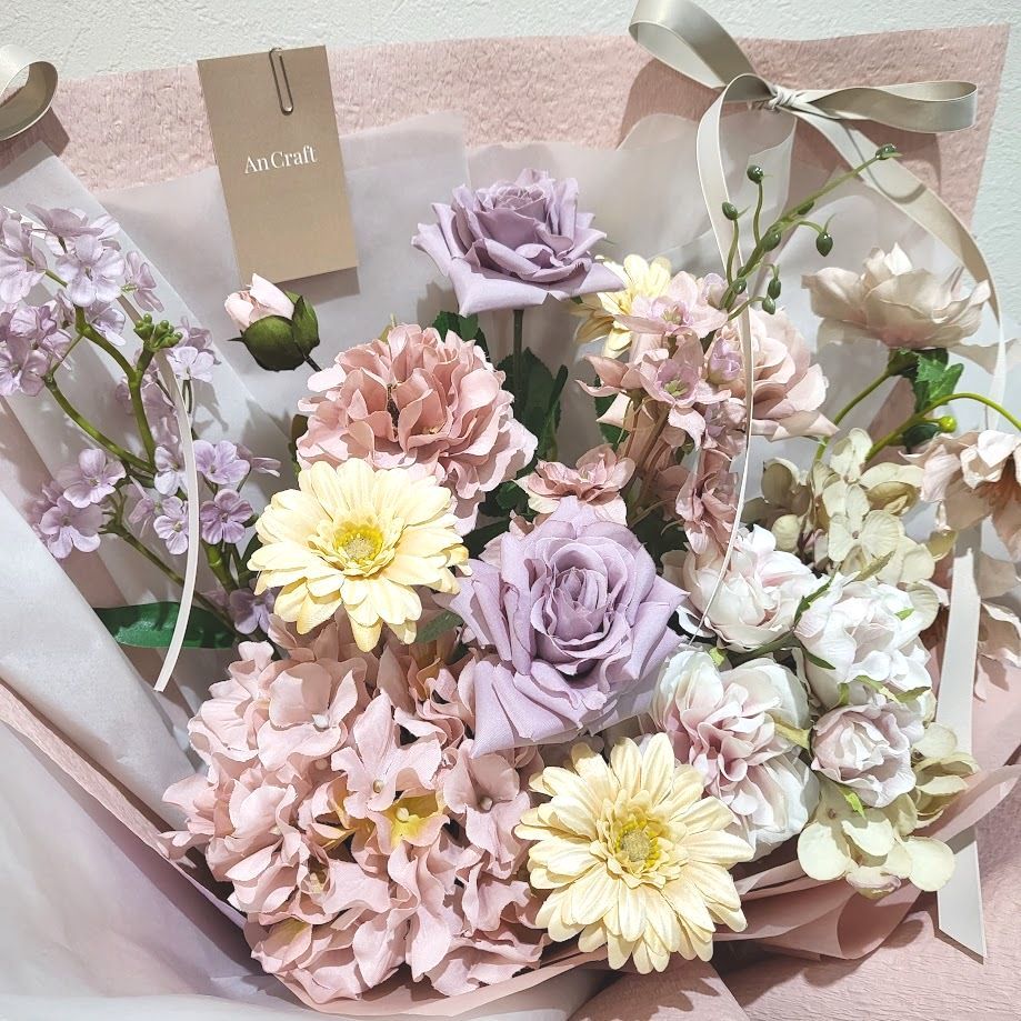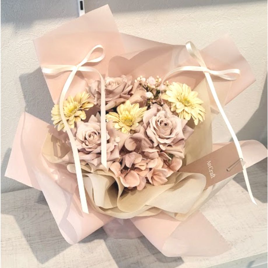 心をつかむニュアンスカラーで束ねた花束です。